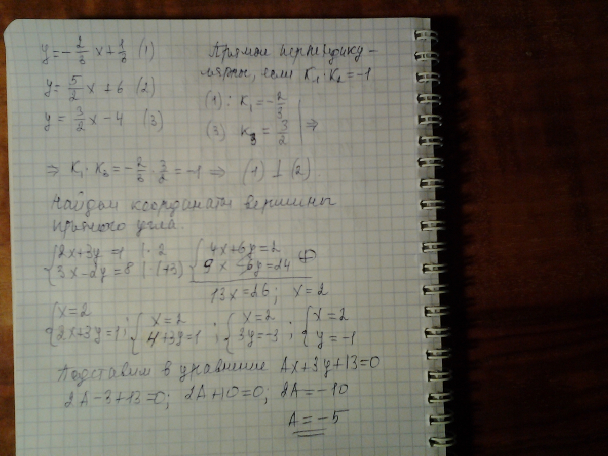 Определить коэффициент А в уравнении прямой Ах+3у+13=0, если известно, что прямая проходит через вершину прямого угла треугольника, заданного уравнениями его сторон 2х+3у-1=0; 5х—2у+12=0 и 3х—2у—8=0.
