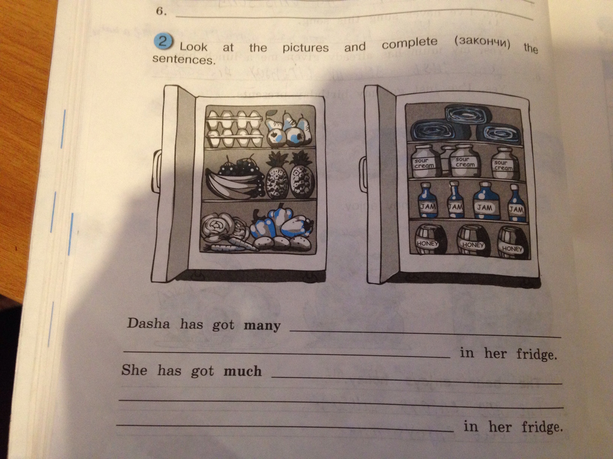 Dasha has got many eggs, pears, bananas, pineapples, carrots, grapes, pepers, parrots. She has got much jam, honey, ice-cream, meat.