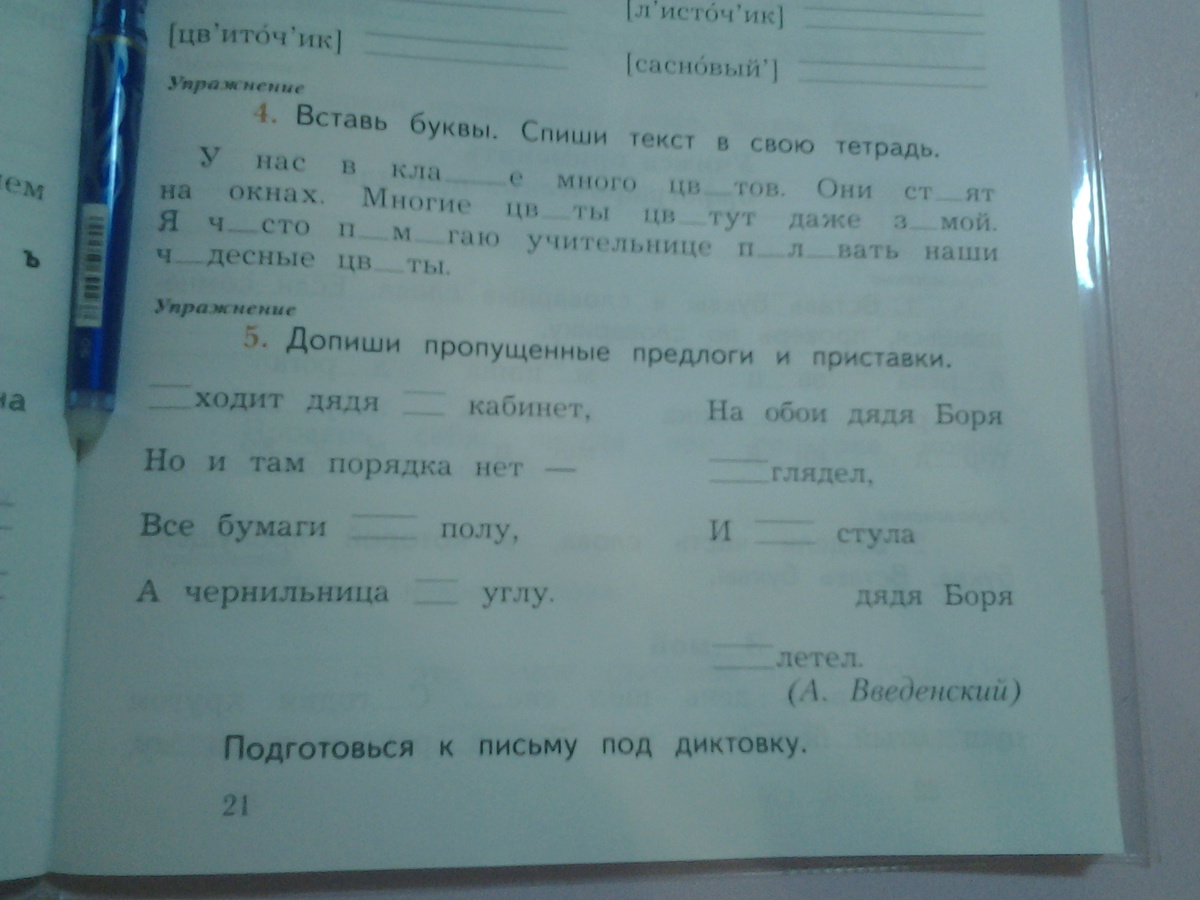 Упр. 4. У нас в классе много цветов. Они стоят на окнах. Многие цветы цветут даже зимой. Я часто помогаю учительнице поливать наши чудесные цветы.