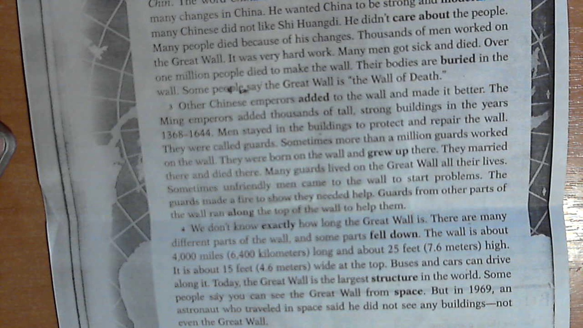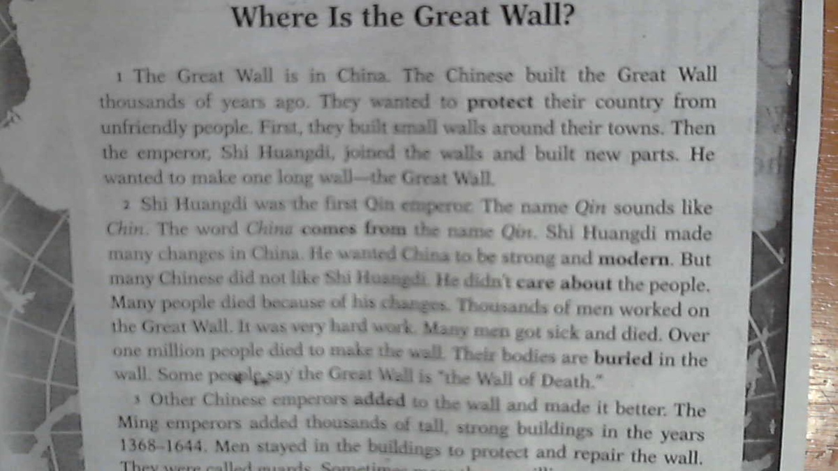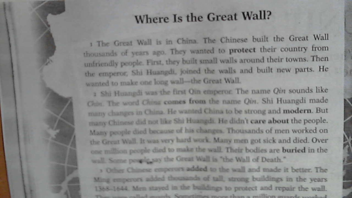 Великая Китайская стена в Китае.Китайцы построили Великую Китайскую стену тысячи лет назад.Они хотели защитить их страну от недоброжелателей.Во первых они построили стены вокруг их городов.Тогда император,Ши Хуанджи,соединил стены и построил новые части.Он хотел сделать одну длинную стену-Великую Китайскую стену.