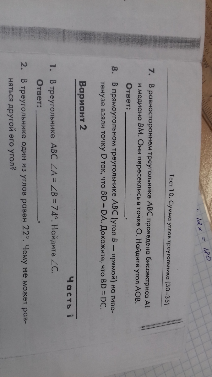7. В равностороннем треугольнике все медианы являются биссектрисами и высотами. ∠ВАО = ∠АВО = 60/2 =30°.