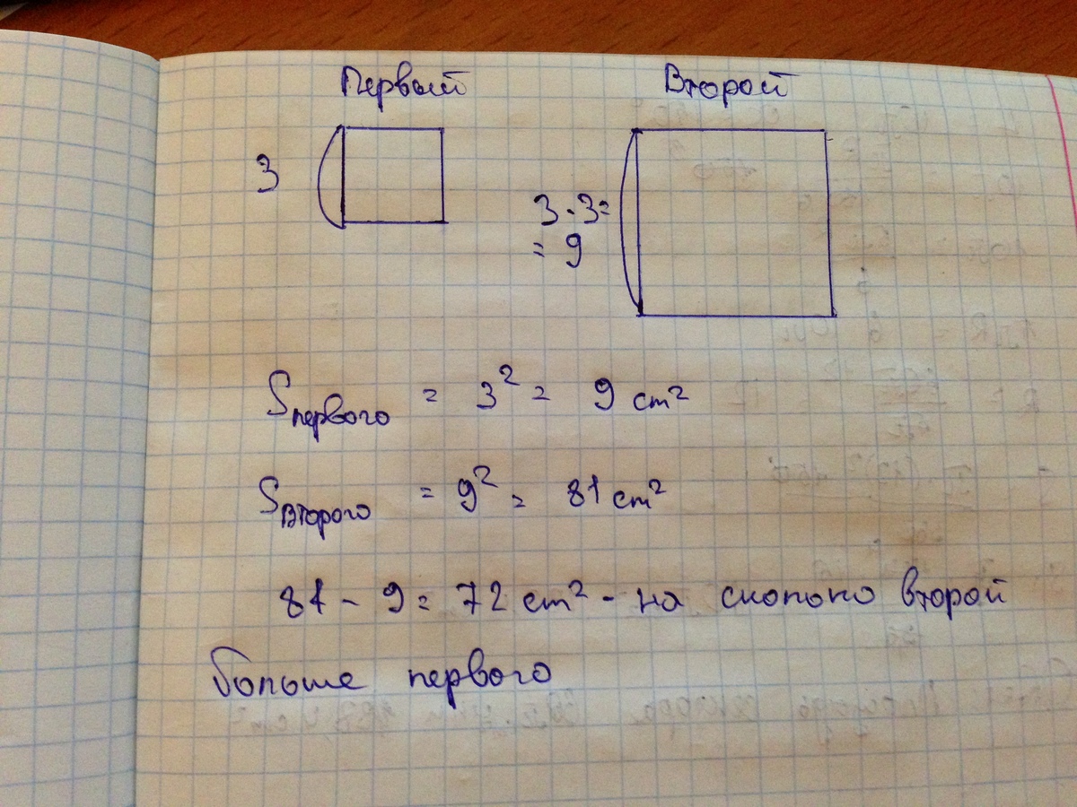 НАЧЕРТИТЕ ДВА КВАДРАТА:СТОРОНА ОДНОГО 3 СМ.ДРУГОГО В 3 РАЗА БОЛЬШЕ.ВО СКОЛЬКО РАЗ ПЛОЩАДЬ ВТОРОГО КВАДРАТА БОЛЬШЕ ПЛОЩАДИ ПЕРВОГО?