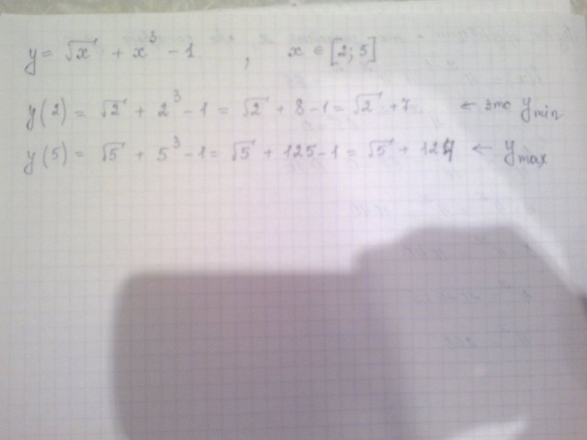 найдите наибольшее и наименьшее значение функции у=корень из х+х^3-1, х принадлежит промежутку [2;5].