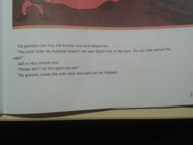 Джек поднимался и поднимался.Бобовый стебель очень высокий и растет вверх внутрь неба сквозь облака.Он достиг самый вверх конца иДжек очень удивился когда он увидил огромный замок.Он побежал в замок и постучался в дверь .Джек очень голодный и хотел спросить что нибудь поесть.Гигантиха открыла дверь.Она очень большаяи она смотрит с огромным удивлением на него.