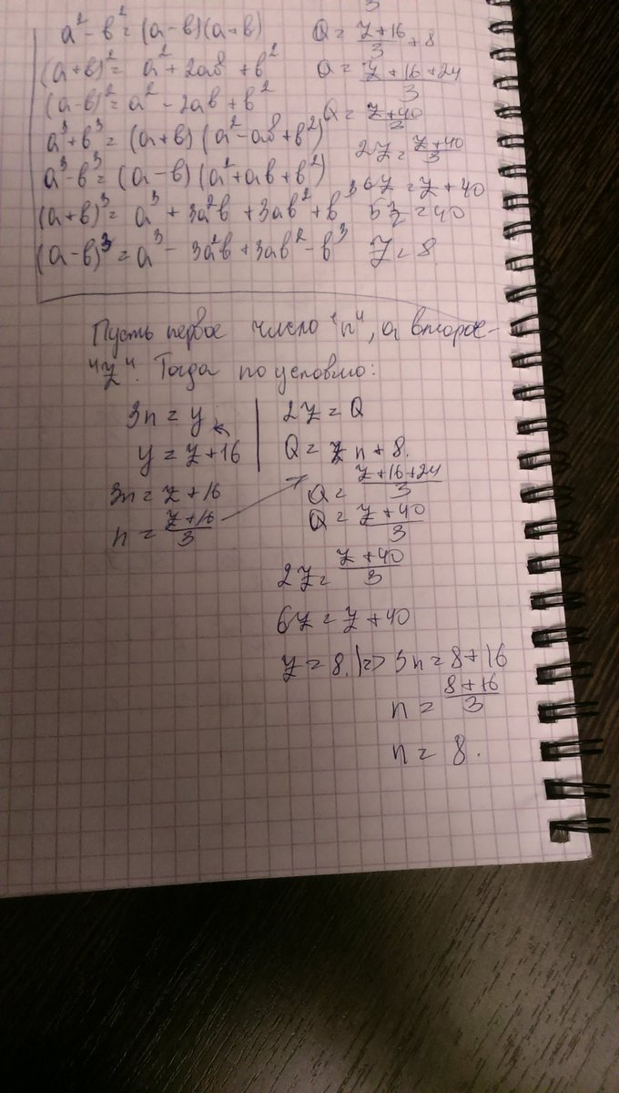 Даны два числа.Если первое число умножить на 3, то полученное число будет на 16 больше второго; если второе умножить на 2 , то полученное число будет на 8 больше первого Найди числа.
