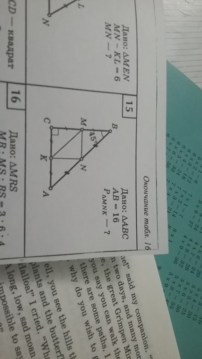 Теперь найдём MN: так как полученный треугольник BMN-равносторонний( Угл М= 90°, а угл В=45°, расчитаем сторону MN по теореме Пифагора: BM(2)=BM(2)+MN(2), 256=BM(MN)(4)→Bm=4