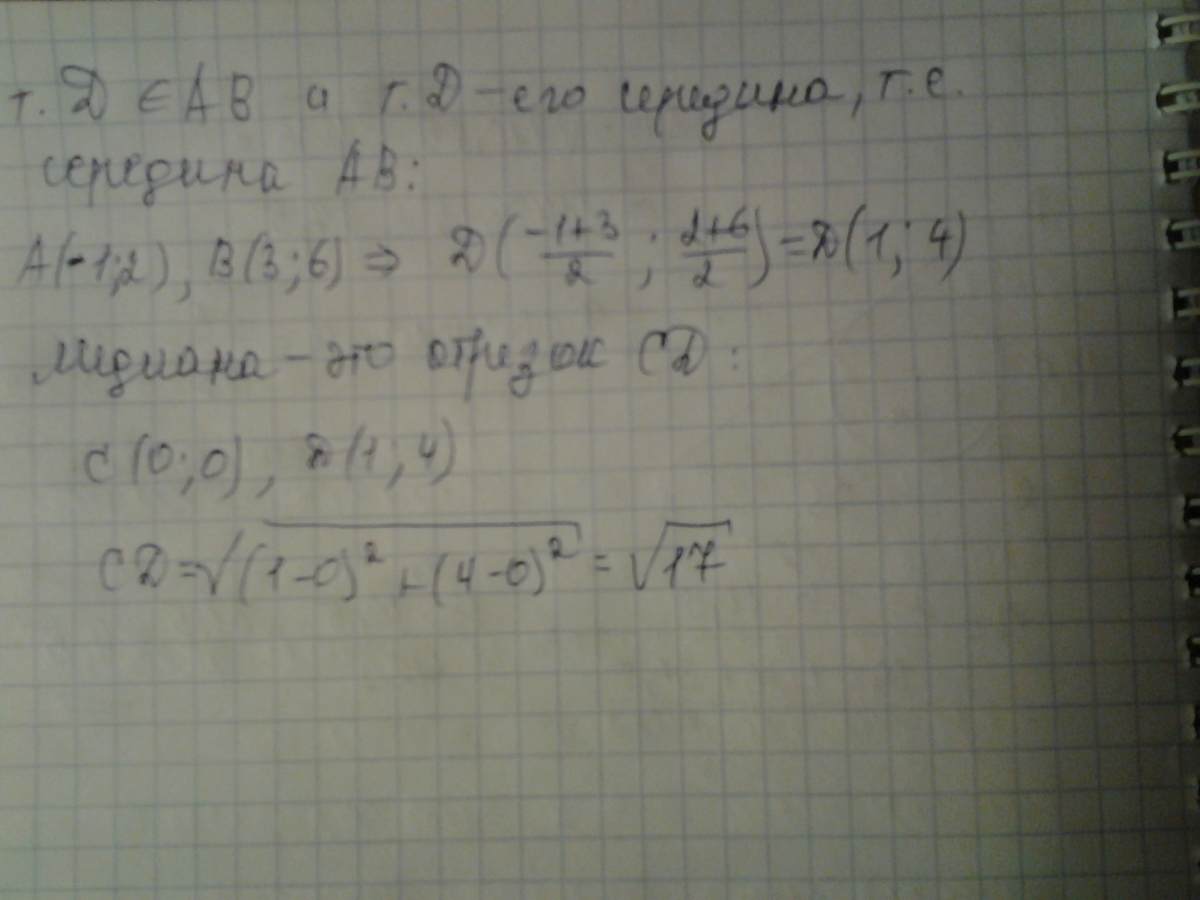 Дано три точки A(-1;2); B(3;6);C(0;0). Найти длинну медианы CD треугольника ABC,если точка D принадлежит отрезку AB.