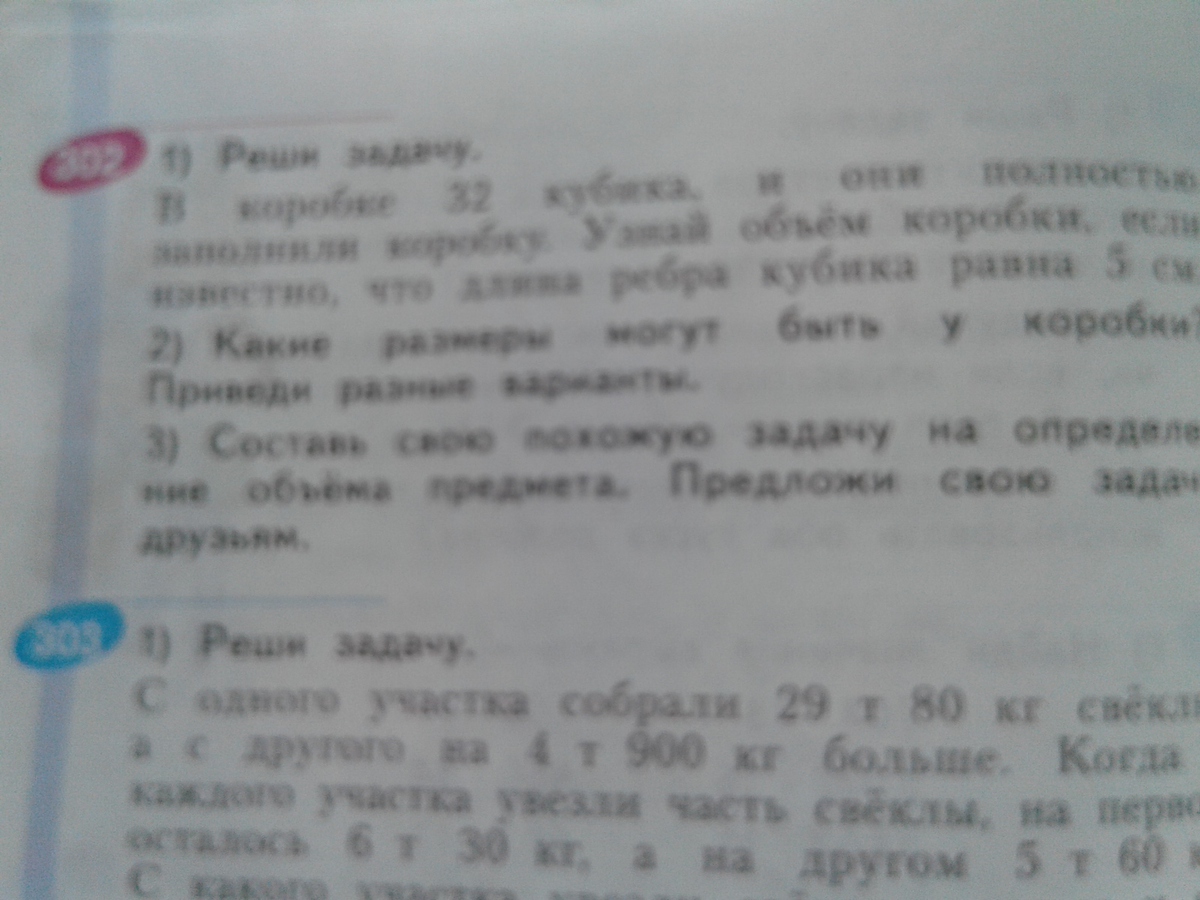 помогите! номер 302 задача. В коробке 32 кубика , и они полностью заполнили коробку. узнай объем коробки, если известно, что длина ребра кубика равна 5 см?