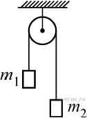 Через неподвижный лёгкий блок перекинута невесомая нерастяжимая нить, к концам которой подвешены два груза массами m1 = 1 кг и m2 = 3 кг (см. рисунок).Пренебрегая трением, найдите силу натяжения нити при движении грузов.