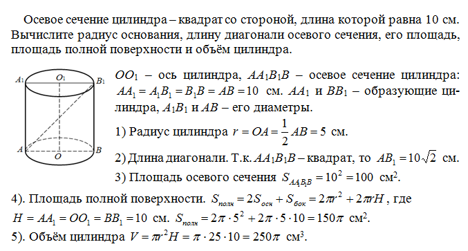 Осевое сечение цилиндра – квадрат со стороной, длина которой равна 10 см. Вычислите