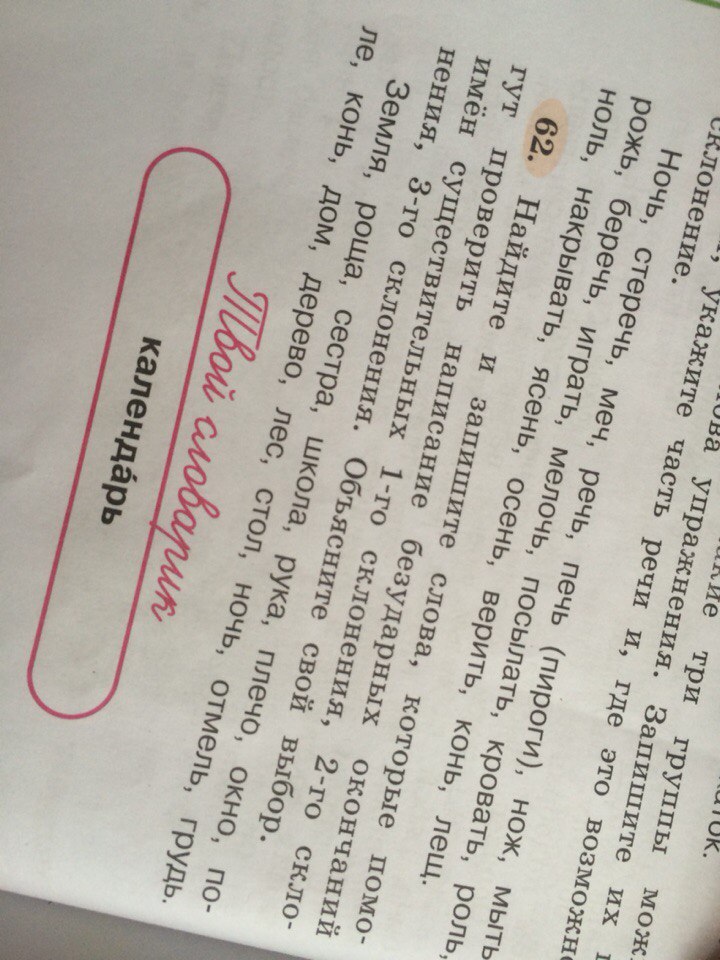 Земля - луна (1-е скл.), Роща - луна (1-е скл), сестра - луна (1-е скл), школа - луна (1-е скл.), рука - луна (1-е скл), плечо - окно (2-е скл), окно - окно (2-е скл), поле - земля (1-е скл), конь - конь (2-е скл), дом - конь (2-е скл), дерево - окно (2-е скл), лес - конь (2-е скл), стол - конь (2-е скл), ночь - печь (3-скл), отмель - печь (3-е скл), грудь - печь (3-е скл)