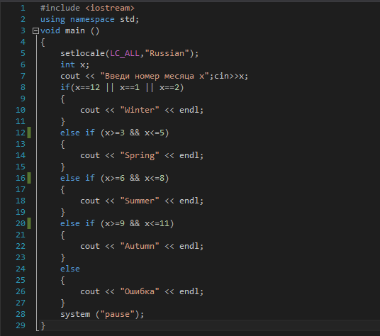 Нужно вывести название времени года (на английском языке), соответствующее введённому номеру месяца ('winter' – зима, 'spring' – весна, 'summer' – лето, 'autumn' – осень). Если введён неверный номер месяца, программы должна вывести слово 'NO'.