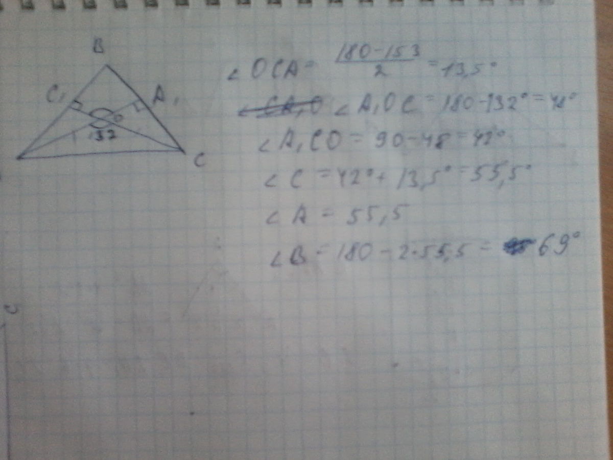 Угол между высотами равнобедренного треугольника,проведенными к боковым сторонам,равен 132 градусов.Найти углы треугольника.