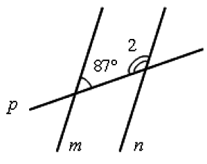 Угол 2 и угол, равный 87°, - внутренние односторонние при пересечении прямых m и n секущей р. Если сумма внутренних односторонних углов равна 180°, то прямые параллельны.