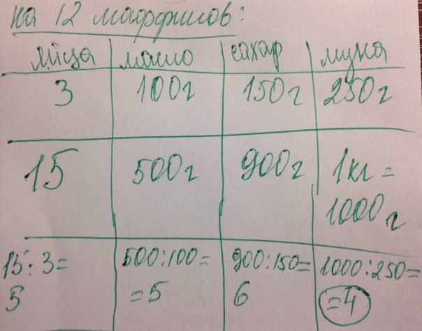 света решила приготовить маффины по рецепту. найденному в интернете. в рецепте сказано. что для приготовления 12 маффинов необходимо 3 яйца 100 граммов масла. 150 граммов сахара и 250 граммов муки. какое максимальное количество маффинов може приготовить Света по найденному рецепту. если у нее есть 15 яиц.500 граммов масла. 900 граммов сахара 1 кг муки