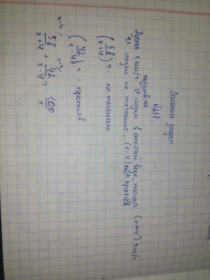 Моторная лодка прошла 58 км по течению реки и 42 км против течения за то же время,что она проходит 100 км в стоячей воде.Найдите скорость лодки в стоячей воде,если скорость течения равна 4 км/ч.Можно по понятней.
