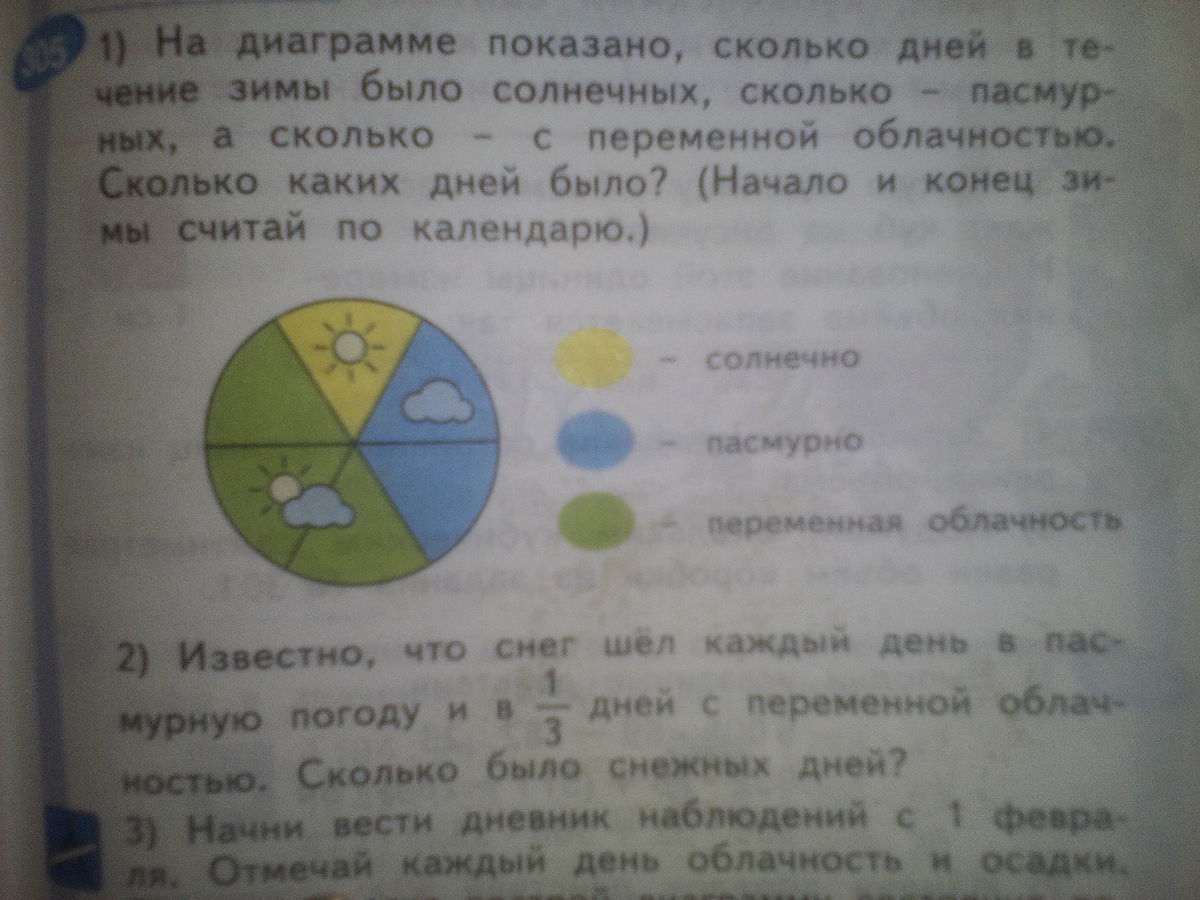 На диаграмме показано, сколько дней в течение зимы было солнечных, сколько - пасмурных, а сколько - с переменной облачностью. Сколько каких дней было?( начало и канец зимы смотрите по календарю