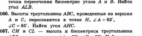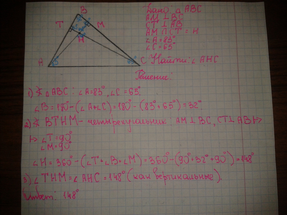 Высоты ΔАВС обозначим АА1, СС1 и проведем третью высоту ВВ1. Найдем третий угол ΔАВС: ∠В=180°-(83°÷65°)=32°. ΔАСА1-прямоугольный, ∠САА1=90°-65°=25°. ΔАСС1-прямоугольный, ∠АСС1=90°--83°=7°. Рассмотрим ΔАНС: ∠АНС=180°-(25°÷7°)=148°