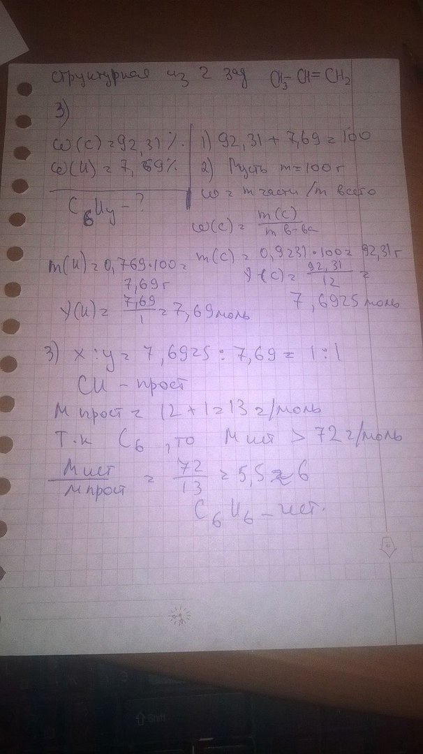 3. Массовая доля углерода и водорода в углеводороде составляют соответственно 92,31% и 7,69%. Приведите молекулярную и структурную формулу данного вещества, если известно,что одна эта молекула содержит шесть атомов водорода .