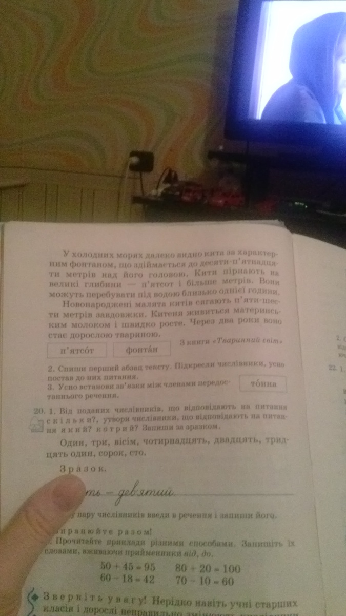 У холодних морях далеко видно кита за характерним. фонтаном. Спеши перший абзац. тексту Пидкресли. числивники усно постав до ных петаня.
