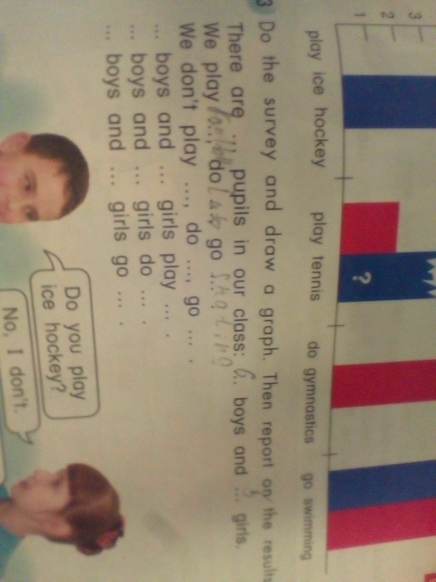 there are ..... puplis in our class: .... boys and .....girls.We play .....,do ....,go .... .