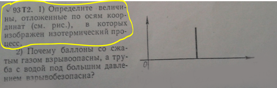 По горизонтальной оси температура Т (К), по вертикальной оси или давление р (Па) или объем V (м3) Изотермический процесс p*V=const.