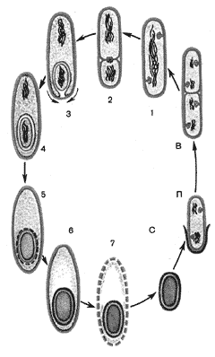 Спора бактерий. когда бактерии некомфортно в своей среде, вокруг неё образуется оболочка, и она выползает из своей цитоплазмы. спора может продержаться до 30 лет, пока не наступит благоприятная для неё среда.
