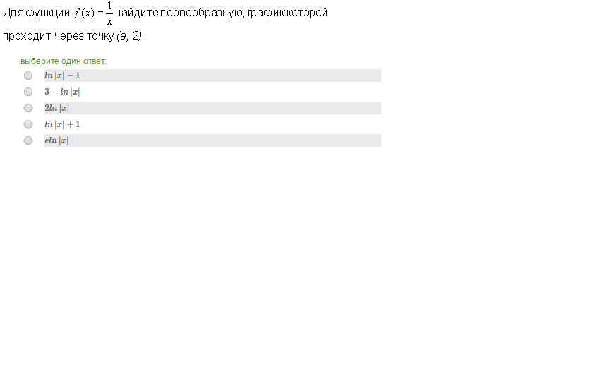 F(x)=int frac{1}{x}, dx=ln|x|+C\\F(e;2); ; Rightarrow ; ; ln|e|+C=2; ; rightarrow ; ; 1+C=2; ,; ; C=1\\Otvet:; ; F(x)=ln|x|+1; ; (N4)