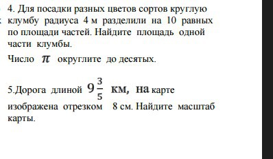 S=3,1*4²=49,6 м² (общая площадь клумбы) "только меня смущает в условии округление π до 10-х. π=3,14, по правилам округления это 3,1"
