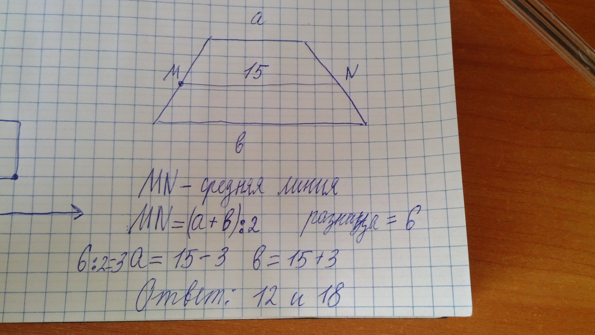 Разность оснований трапеции равна 6 см , её средняя линия равна 15 см. Найдите основание трапеции.
