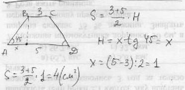 в равнобедренной трапеции основания равны 3 и 5, а один из углов между боковой стороной и основанием равен 45 градусов. Найдите площадь трапеции