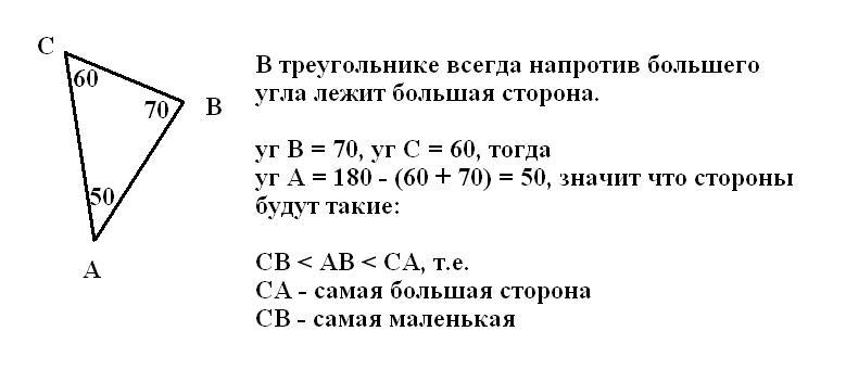 в треугольнике ABC угол B = 70 градусов, угол C 60 градусов. Сравните стороны треугольника.