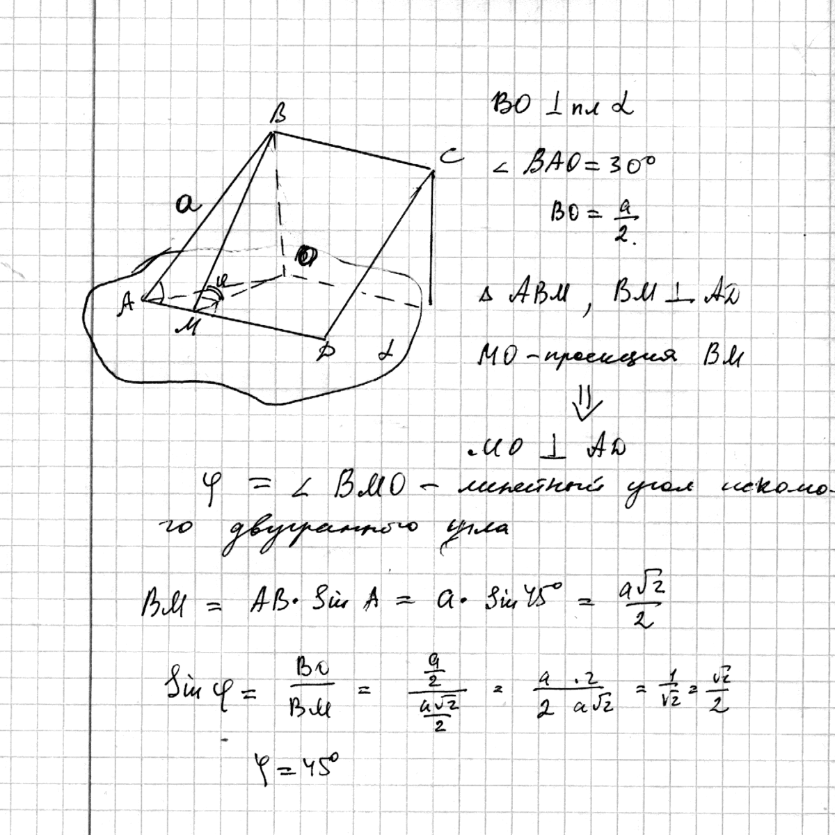 Через сторону ромба ABCD проведена плоскость a. Сторона AB составляет с этой плоскостью угол в 30 градусов. Найти угол между плоскостью ромба и плоскостью a, если острый угол ромба равен 45 градусам.