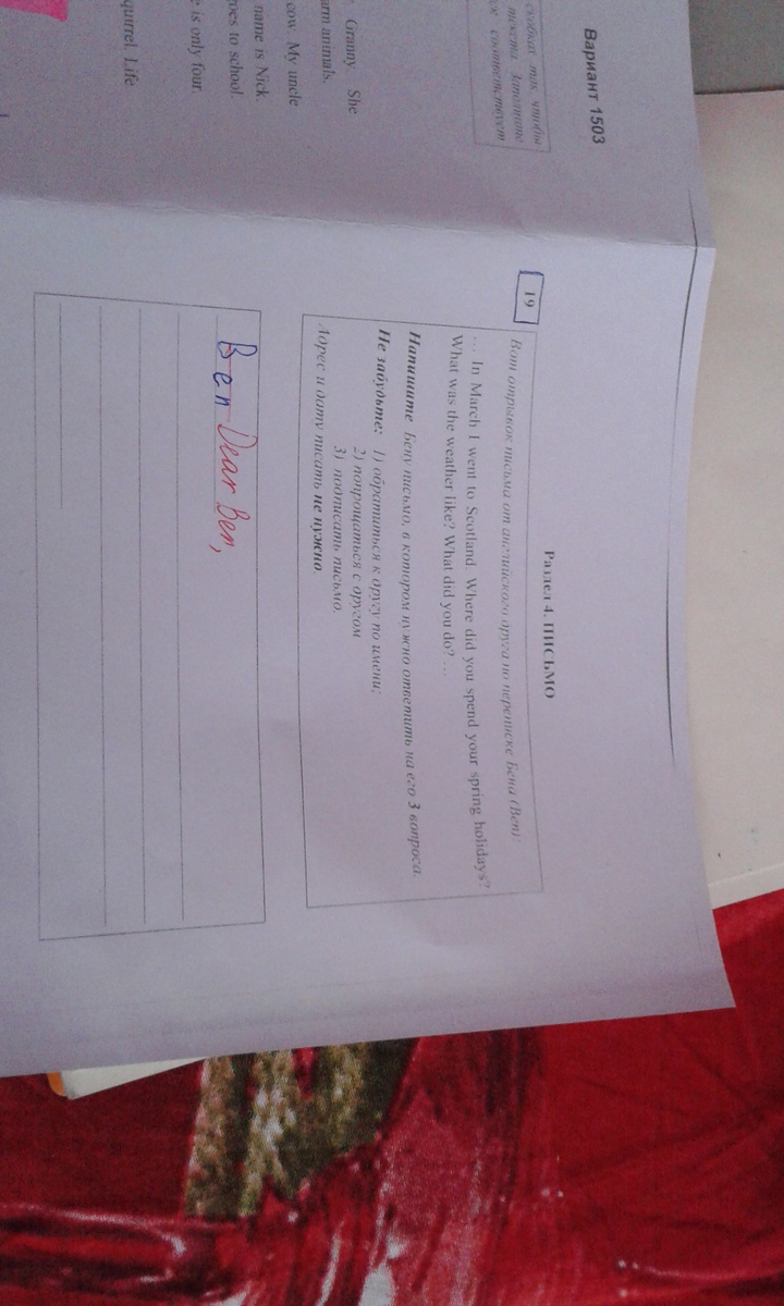 Dear Ben, I spend my holidays in my city at home. I read (рэд) very interesting books. So, I drew pictures with nature. At the evening I with my family spoke at the table about funny moments in our life. I don't think that the weather was good and warm. My friend Ben, do you like when it's raining? I very like to look at wet trees and roads. And this is wonderful smell...I very like it. I sad about my spending spring time. I hope you answer me soon. Good bye, Ben. Love (имя свое)