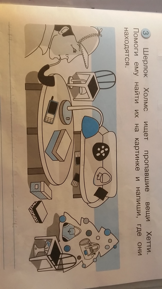 шерлок холмс ищет пропавшие вещи Хетти Помоги ему найти их на картинке и напиши, где они находятся.