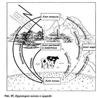 Круговорот азота — биогеохимический цикл азота. Большая его часть обусловлена действием живых существ. Очень большую роль в круговороте играют почвенные микроорганизмы, обеспечивающие азотистый обмен почвы — круговорот в почве азота, который присутствует там в виде простого вещества (газа — N2) и ионов: нитритов (NO2-), нитратов (NO3-) и аммония (NH4+). Концентрации этих ионов отражают состояние почвенных сообществ, поскольку на эти показатели влияет состояние биоты (растений, микрофлоры), состояние атмосферы, вымывание из почвы различных веществ. Они способны снижать концентрации азотсодержащих веществ, губительные для других живых организмов. Они могут переводить токсичный для живых существ аммиак в менее токсичные нитраты и в биологически инертный атмосферный азот. Таким образом, микрофлора почвы способствует поддержанию стабильности её химических показателей.