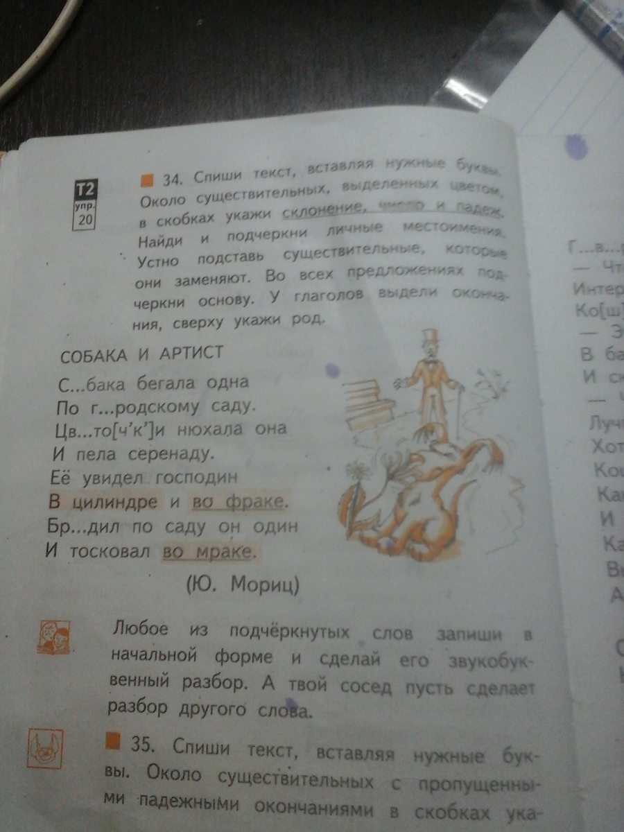 Собака городскому цветочки бродил. В цилиндре - Пр. П.,2 скл., ед.ч. во фраке - Пр.П., 2 скл., ед.ч.,во мраке - Пр.П., 2 скл., ед.ч. Собака бегала, Она нюхала и пела, господин увидел, он бродил и тосковал. Бегала окончание а, ж.р. нюхала окон. а, ж.р. пела окон. а, ж.р. увидел окон. 0-евое, м.р. бродил окон. 0-евое, м.р. тосковал окон. 0-евое.