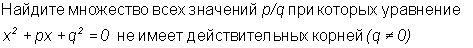 Найдите множество всех значений p/q при которых уравнение x^2+px+q^2=0 не имеет действительных корней (q не равно 0).