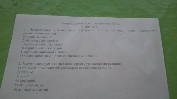 6) С6Н5СН3 (толуол же) + 3НО-NO2 = (условие: серная кислота, t) тротил + 3Н2О