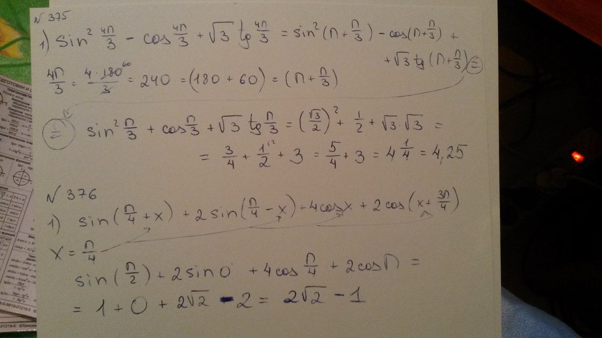 Сделала вам по одному примеру. Остальные по аналогии. Везда надо подставить значение вместо икс и в 375 воспользоваться формулами приведения. После этого посмотреть значения по таблице.