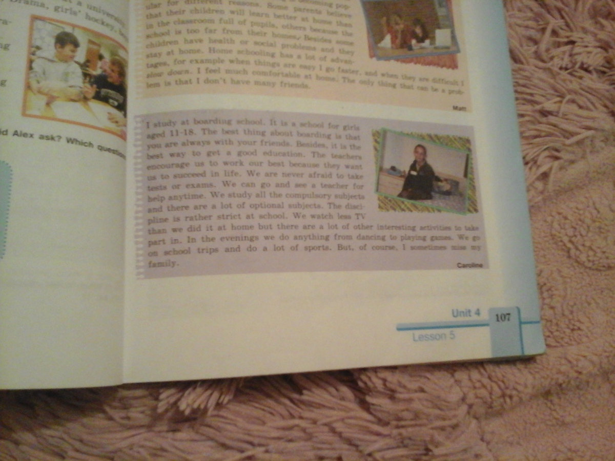 Я учусь в школе-интернате. Это школа для девочек с 11 до 18 лет. Лучшая вещь в обучении в школе-интернате это то, что ты всегда находишься с друзьями. К тому же, это лучший способ получить хорошее образование. Учителя способствуют тому,чтобы мы лучше учились, потому что они хотят, чтобы мы хорошо устроились в жизни. Мы никогда не боимся писать тесты или экзамены. Мы можем подойти к учителю и попросить его помочь нам в любое время. Мы изучаем все обязательные предметы, но здесь также есть много дополнительных предметов. Дисциплина довольно строгая в школе. Здесь мы смотрим ТВ меньше, чем дома, но здесь есть много других интересных увлечений, в которых мы можем принять участие. Вечерами мы много чем занимаемся, начиная танцами и заканчивая играми. Мы посещаем школьные экскурсии и много занимаемся спортом. Но, конечно же, иногда я скучаю по своей семье.