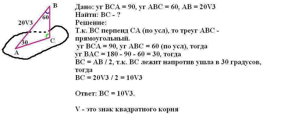 Угол между наклонной и перпендикуляром к плоскости равен 60 градусам длинна наклонной равна 20 корень из 3 . определить длину перпендикуляра .