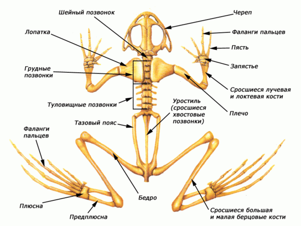 Скелет конечностей образован скелетом пояса конечностей и скелетом свободных конечностей. Плечевой пояс лежит в толще мускулатуры и включает парные лопатки, ключицы и вороньи кости, соединённые с грудиной. Скелет передней конечности состоит из плеча (плечевая кость) , предплечья (лучевая и локтевая кости) и кисти (кости запястья, пястья и фаланги пальцев) . Тазовый пояс состоит из парных подвздошных седалишных и лобковых костей, сросшихся между собой. Он прикреплён к крестцовому позвонку через подвздошные кости. В состав скелета задней конечности входят бедро, голень (большая и малая берцовая кости) и стопа. Кости предплюсны, плюсны и фаланги пальцев. У бесхвостых кости предплечья и голени сливаются. Все кости задней конечности сильно удлинены, образуя мощные рычаги для передвижными прыжками.
