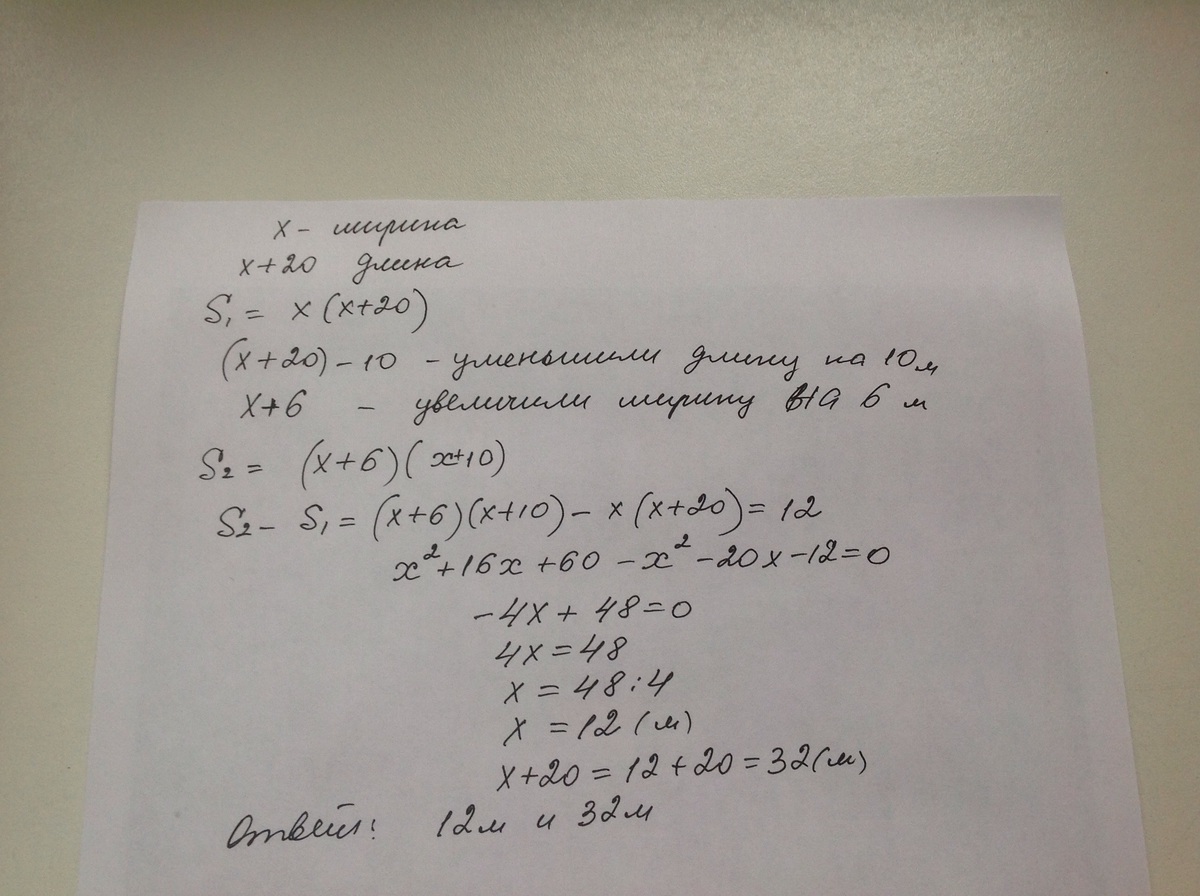 длина прямоугольника на 20 м больше его ширины. если длину прямоугольника уменьшить на 10 м , а ширину увеличить на 6 м , то его площадь увеличиться на