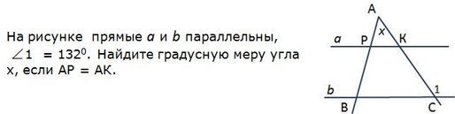 Угол ВСК = 180 - угол 1 = 180-132=48 градусов. Угол ВСК = угол РКА как соответственный, а раз АР=АК, то треугольник АРК равнобедренный, и угол АРК=угол АКР=48 градусов. Тогда угол РАК=180-48-48=84 градуса.