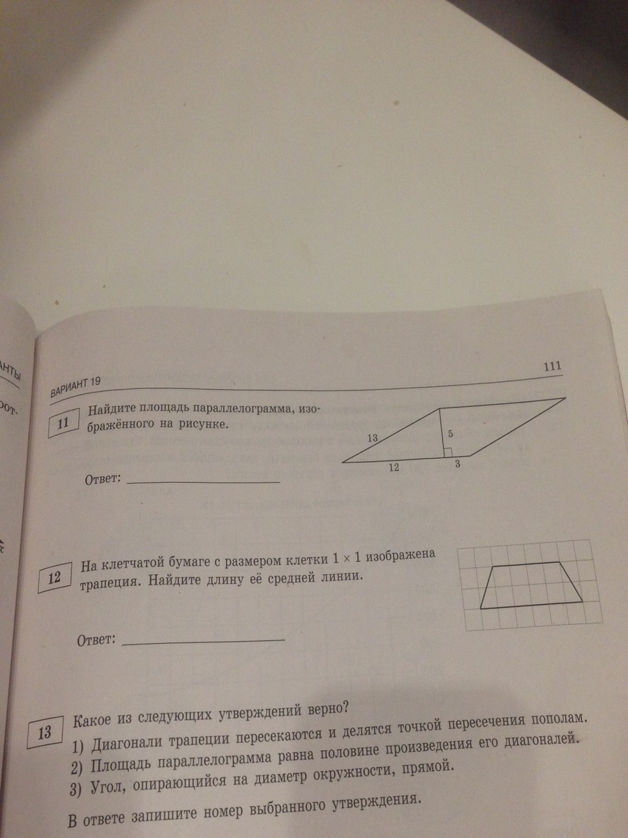 №11. Площадь параллелограмма - а*h, где а - сторона, на которую опущена высота, а h - высота. h=5, а=12+3=15. Площадь равна 15*5=75.