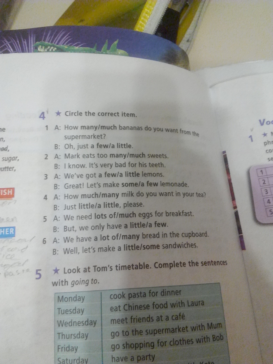 1 How many bananas do you want from the supermarket? Oh, just a few. 2 Mark eats too many sweets.I know. It's very bad for his teeth.
