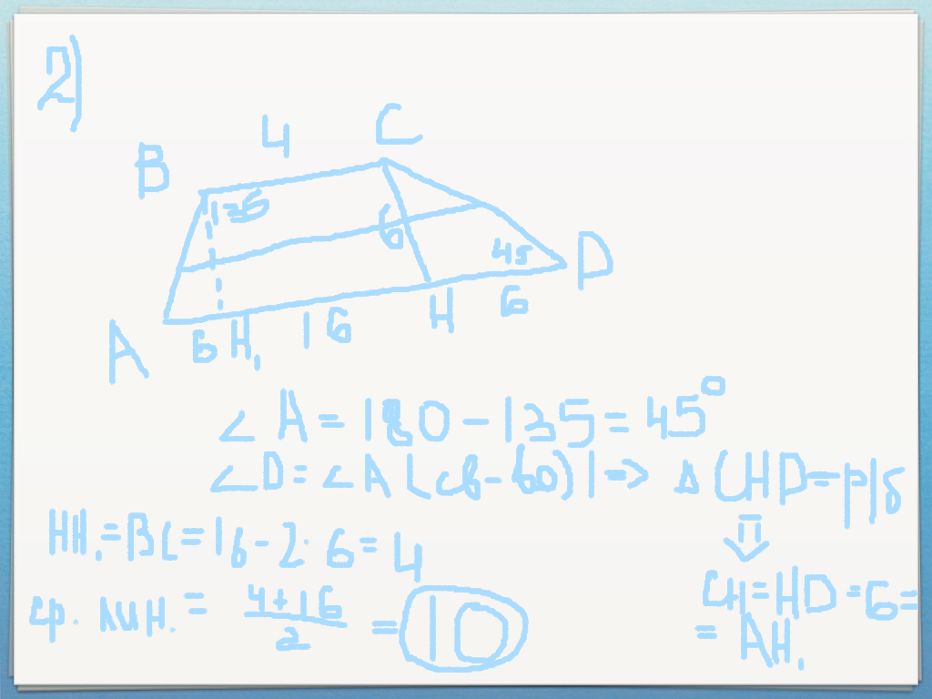 2) Один из углов равнобедренной трапеции равен 135 градусов, большее основание и расстояние между прямыми, содержащими основания , равны соответственно 16 см и 6 см. Найдите среднюю линию трапеции.