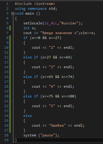Задание 2: написать программу выставление оценок по 100 шкале. Меньше 27 баллов "2", больше 27 и меньше 64 "3", больше 65 и меньше 74 "4", выше 75 "5". заранее спс