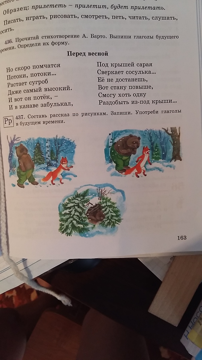 Один раз шли медведь и лиса. Разговаривали они и вдруг Косолапый медведь поскользнулся и наступил лисе на хвост. Как взвыла лиса-птицы из гнезд вылетели. Испугался медведь и залез в большую яму. Искала лиса медведя, искала, да не нашла. А пока она его искала медведь в яме уснул. так и спит он в яме зимой. Боится снова лисе на хвост наступить!